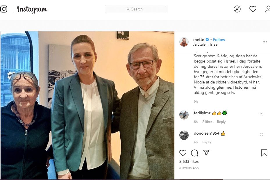גם ראשת הממשלה של דנמרק, מטה פרדריקסן ( Mette Frederiksen ) העלתה לאינסטגרם שלה תמונה ממפגש עם רוברט וג'יתט ששרדו את השואה. רוברט נלכד והובא לטרזיינשטט כילד בן 15 שנה בלבד. למרבה המזל, הם ניצלו מפשעי הנאצים. אביו ואחיו של רוברט טבעו בסאונד בדרכם לשבדיה בזמן שאחותו עשתה הצליחה במסע. כך גם ג'יתט. שהגיעה לשבדיה כילדה בת 6 ובהמשך עלו לישראל ומאז הם פה." עוד כתבה כי "היום הם סיפרו לי את סיפוריהם כאן בירושלים, לרגל אירועי הנצחת 75 שנה לשחרור אושוויץ. אלו כמה מהעדויות האחרונות שעוד יש לנו. כתבה "אסור לשכוח לעולם. אסור שההיסטוריה תחזור על עצמה".